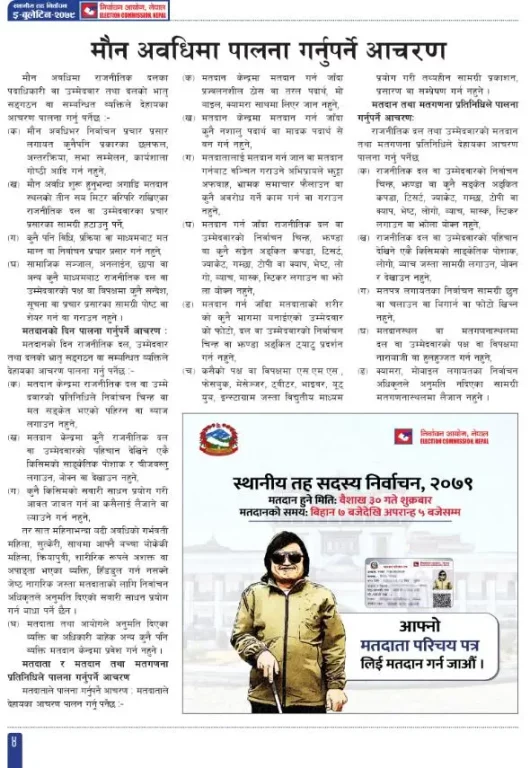 मौन अवधिमा उम्मेदवार वा राजनीतिक दलको प्रचारप्रसार हुने गरी कुनै समाचार वा सूचना प्रकाशन वा प्रसारण गर्न नहुने निर्वाचन आयोगले सबै सरोकारवाला पक्षको ध्यानाकर्षण गराएको छ ।