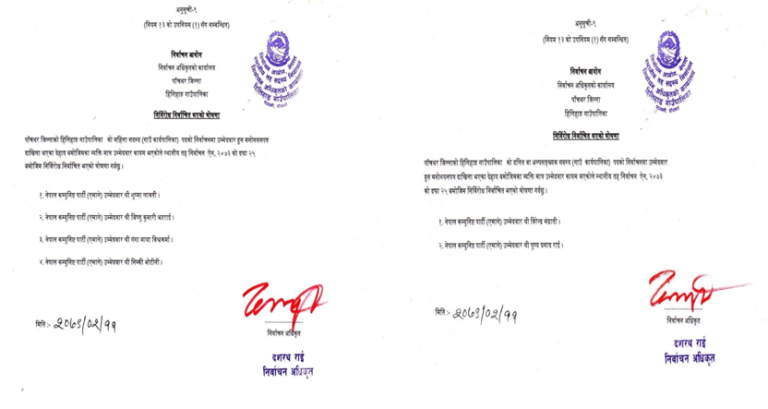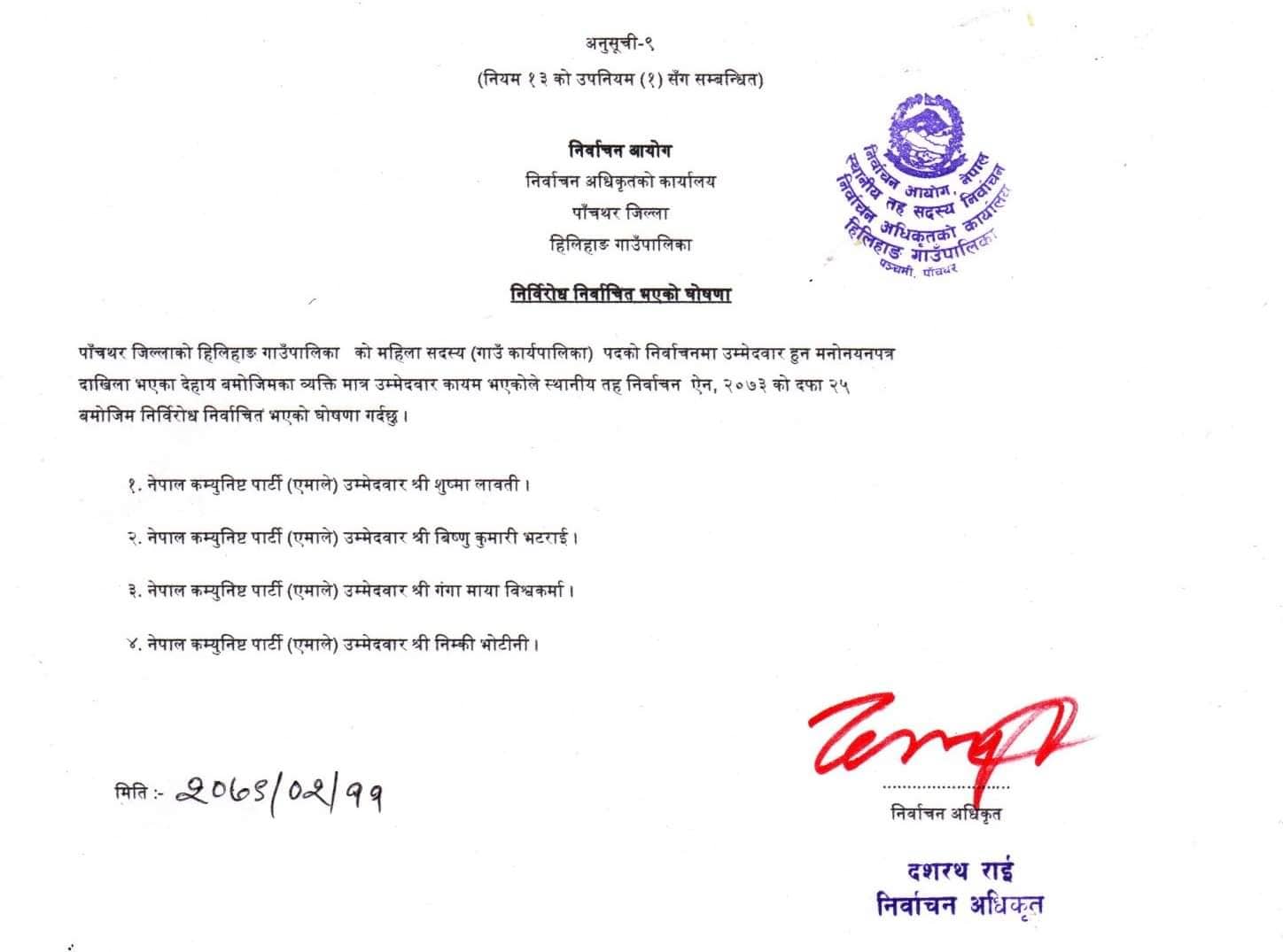 निर्वाचन अधिकृतको कार्यालय हिलिहाङले प्रकाशित निर्वाचन तालिका अनुसार अन्य कुनै दलको मनोनयन नपरेको एवं उमेद्वार उपर दावि विरोध समेत नरहेकोले निज सदस्यहरु निर्विरोध निर्वाचित हुनभएको निर्वाचन अधिकृत दशरथ राईले बताउनु भयो ।
