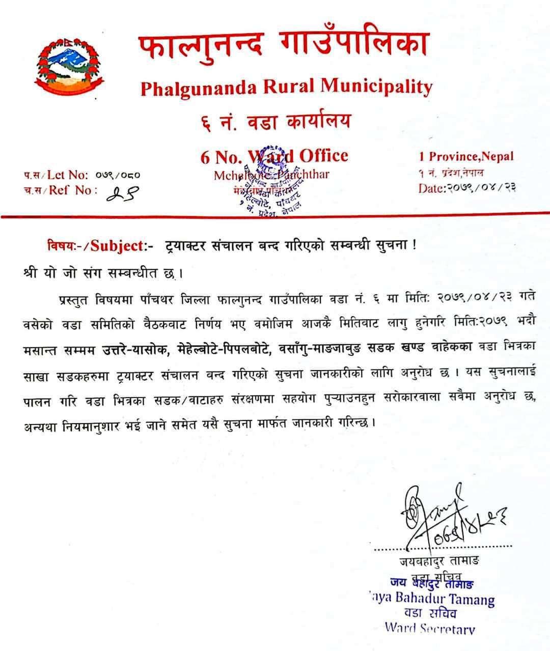 उक्त वडामा आजबाटै लागुहुने गरी उत्तरे–यासोक, मेहेलबोटे–पिपलबोटे र वसाँगु– माङ्जाबुङ सडकखण्ड बाहेकका वडा भित्रका शाखा सडकहरुमा २०७९ भदौ मसान्तसम्म ट्याक्टर सञ्चालन गर्न बन्द गरिएको हो ।