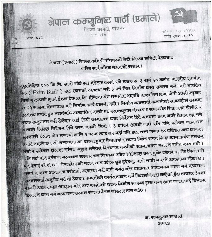 गत आईतबार बसेको एमाले पाँचथर जिल्ला कमिटीको छैटौं बैठकले सार्वजनिक महत्वको प्रस्ताव पारित गर्दै नयाँ ठेक्का प्रक्रियामा जान सरकार संग माग गरेको हो ।