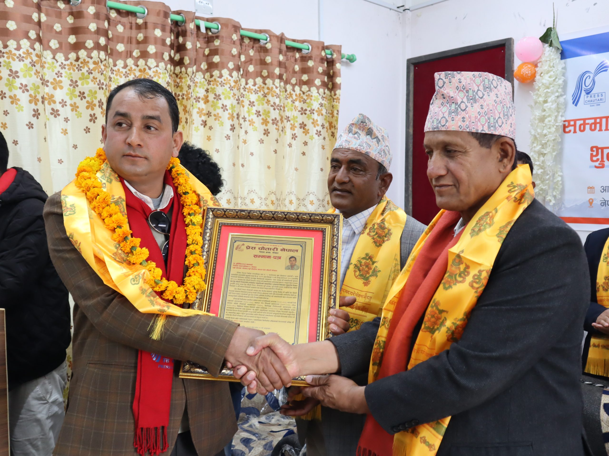 पाँचथर । प्रेस चौतारी नेपालको रजत जयन्ती (२५ औं स्थापना दिवस) को अवसरमा प्रेस चौतारी पाँचथरले शक्ति पोष्ट डटकमका सम्पादक युधिष्ठिरराज आमगाई र गोरखापत्र दैनिकका पाँचथर प्रतिनिधि नारायण तुम्बापोलाई सम्मान गरेको छ ।