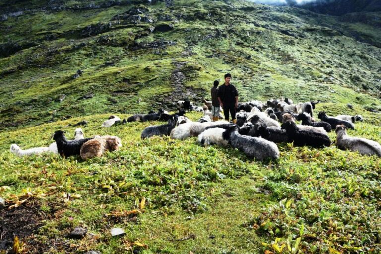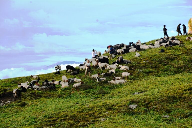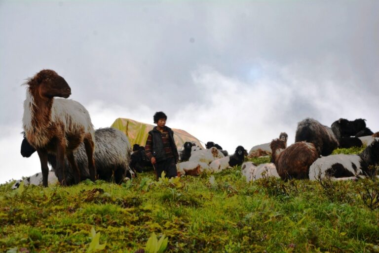 फोटोः पाँचथरको याङ्वरक गाउँपालिका–२, तिम्बुपोखरी क्षेत्रमा घुम्ती शिविर भेडीगोठमा चरिरहेका भेडा । तस्विरहरु नारायण तुम्बापो
