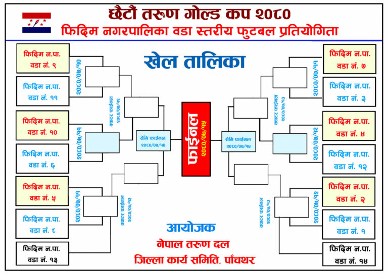 फिदिम । छैटौं तरुण गोल्ड कप २०८० आजदेखि फिदिममा सुरु हुने भएको छ । फिदिम नगरपालिका वडा स्तरीय फुटबल प्रतियोगिताका रुपमा आयोजना हुने गोल्डकपको दिउँसो १ः०० वजे उद्घाटन हुने भएको छ ।