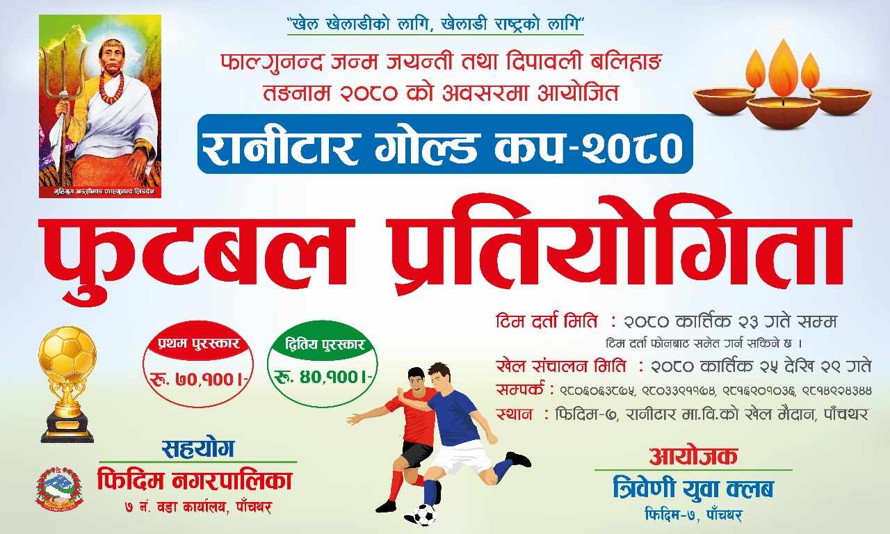 पाँचथर । रानीटार गोल्डकप २०८० आजवाट फिदिम नगरपालिका ७ स्थित रानीटार माविको खेल मैदानमा सुरु हुने भएको छ ।