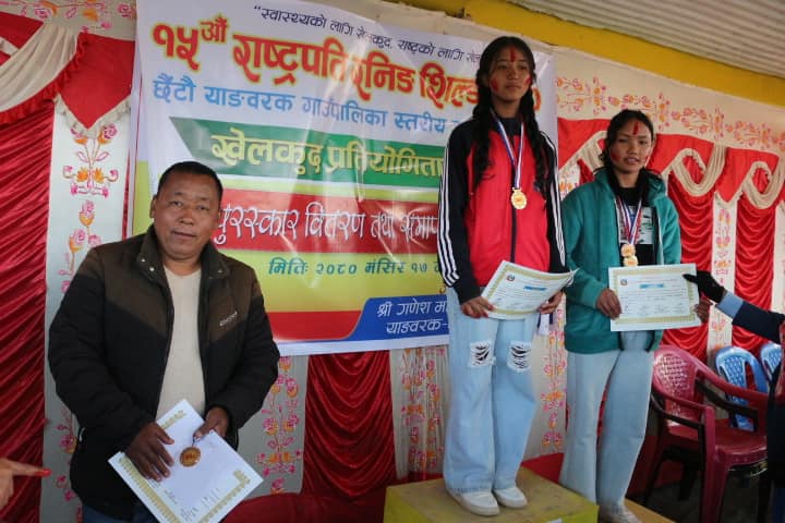 याङवरक गाउँपालिका ६ नागीमा आईतबार सम्पन्न प्रतियोगितामा गणेश माविले २५ स्वर्ण, १३ रजत र ६ कास्य गरी कुल ४४ पदक सहित रनिङ शिल्ड उचालेको हो । प्रतियोगितामा दोस्रो स्थान हाँसिल गरेको थर्पु माविले १४ स्वर्ण, १३ रजत र १२ कास्य कुल ३९ पदक हात पा¥र्यो । गुप्तेश्वर माविले ४ स्वर्ण, ५ रजत र १ कास्य सहित कुल १० पदक सहित तेस्रो स्थान हाँसिल गरेको छ ।