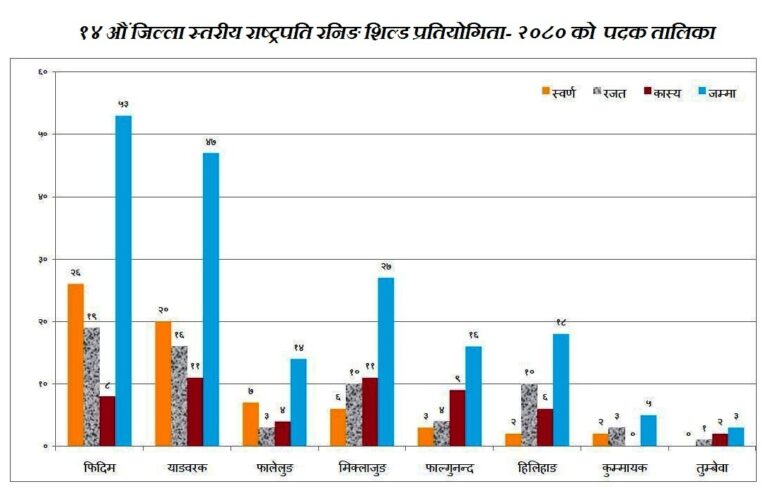 फिदिम माविको खेलमैदानमा बुधबार सम्पन्न प्रतियोगितामा २६ स्वर्ण, १९ रजत र ८ कास्य सहित कुल ५३ पदक सहित फिदिम नगरपालिकाले उपाधी हात पारेको हो । लगातार तीन पटक उपाधी हात पारेसँगै फिदिम नगरपालिकाले रनिङ शिल्ड कब्जा समेत गरेको छ ।
