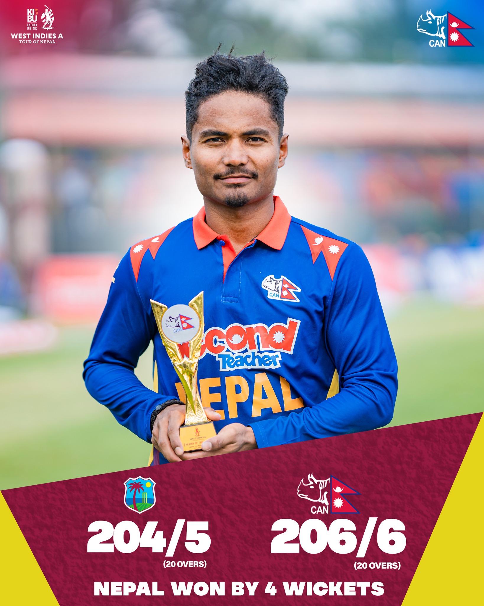 वेस्ट इन्डिज टोलीले प्रस्तुत गरेको २ सय ५ रनको लक्ष्य पछ्याउने क्रममा कप्तान रोहितले उत्कृष्ट ब्याटिङ प्रदर्शन गर्दै नेपाललाई ४ विकेटको जितसम्म पुर्याए । नेपालले ६ विकेटको नोक्सानीमा लक्ष्य पूरा गरेको हो ।
