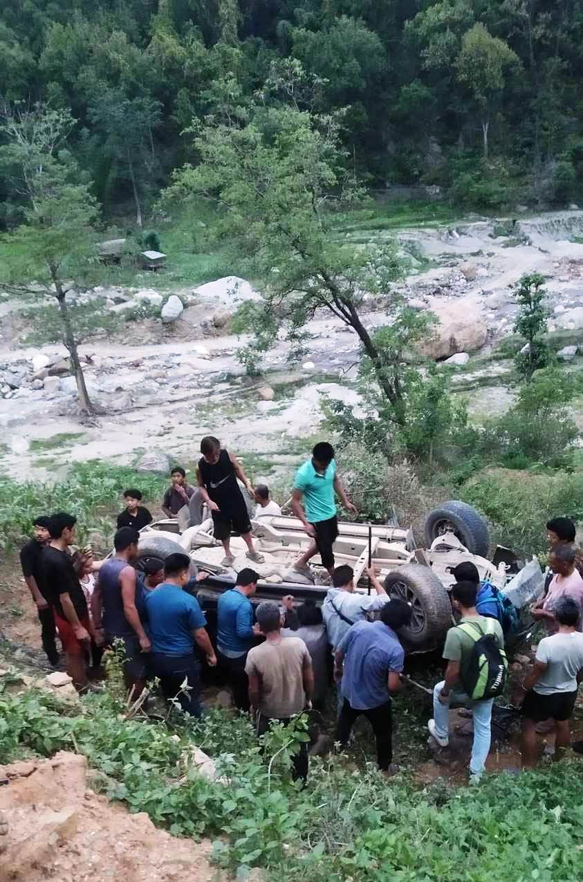 शुक्रबार साँझ करिब ५ः४५ बजेको समयमा ताप्लेजुङबाट झापातर्फ जादै गरेको त्रिशक्ति कन्ट्रक्सनको कर्मचारीहरू बोक्ने बा १७ च ७९९९ नं. को फरचुनर टोयटा गाडी अनियन्त्रित भई सडकदेखि करिव २०/२५ मिटर तल झरी दुर्घटना भएको हो ।