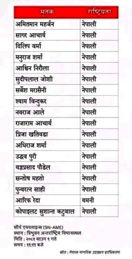 काठमाण्डौवाट पोखराका लागि उडेको जहाज दुर्घटना हुँदा त्यसमा सवार १९ मध्ये एयरलाईन्सका १८ जना कर्मचारीको मृत्यू भएको हो । घाईते अवस्थमा उद्धार गरिएका जहाजका पाईलट मनिष शाक्यको भने सिनामंगलस्थित काठमाडौं मेडिकल कलेजमा उपचार भईरहेको छ ।