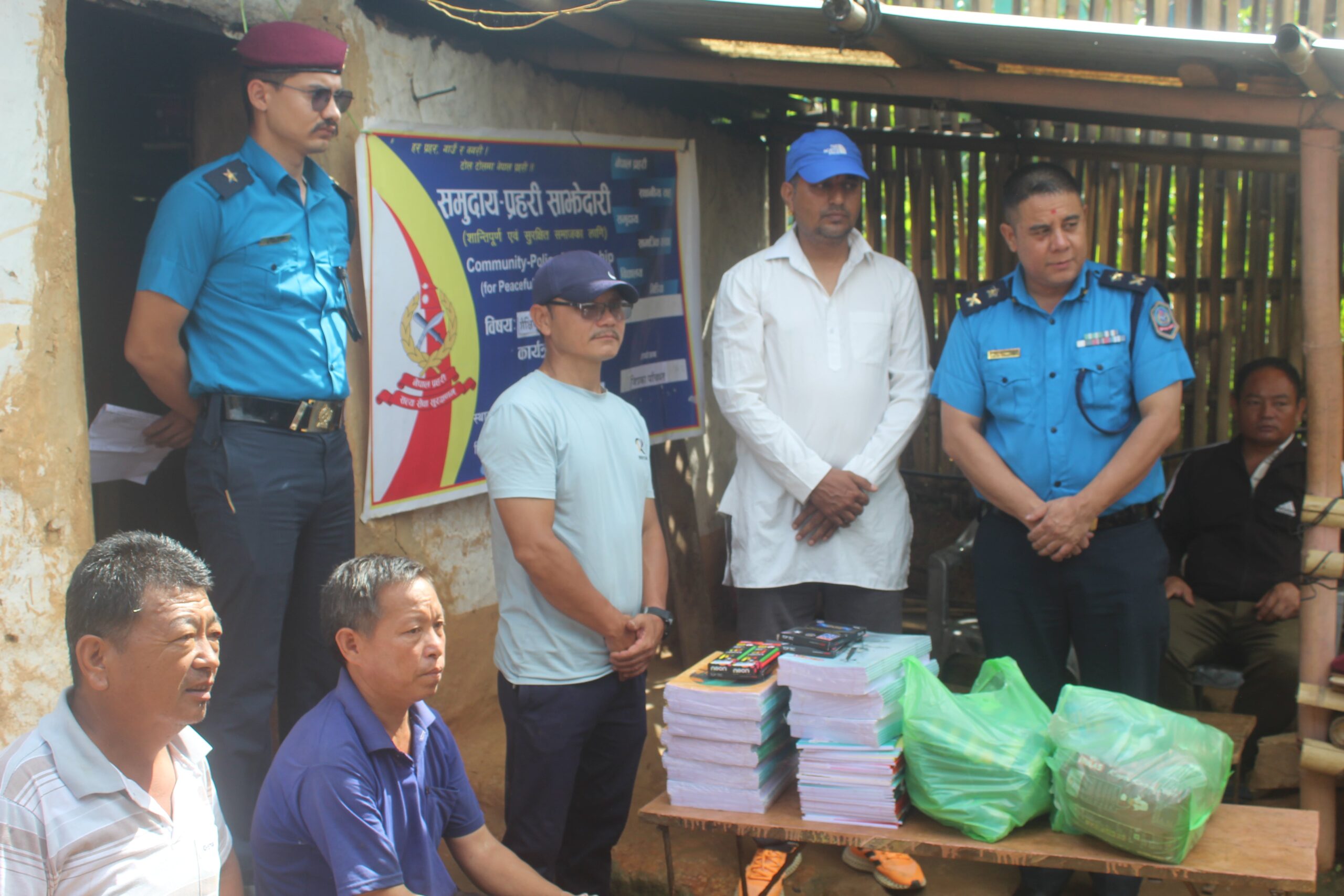 समुदाय प्रहरी साझेदारी कार्यक्रमसंग समेत आधारित भएर आवासीय विद्यार्थीलाई शैक्षिक सामग्री वितरण गरिएको प्रहरी कार्यालयले जनाएको छ । प्रहरी नायव उपरिक्षक हेमन्त भण्डारी क्षेत्रीले शैक्षिक सामग्रीआवासीय कक्षा सञ्चालक समिति संयोजक गंगा ईंवा लिम्बु लाई प्रदान गर्नु भयो ।