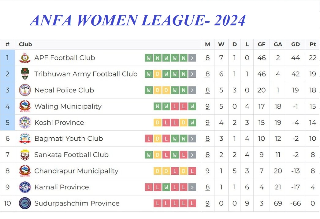 जारी लिगमा २२ अंकका साथ एपिएफ शिर्ष स्थानमा रहेको छ । १९ अंक जोडेको त्रिभूवन आर्मी दोस्रो र १८ अंक जोडको नेपाल पुलिस तेस्राे स्थानमा रहेका छन् । तीन ओटै विभागीय क्लबले लिग चरणका एक-एक खेल खेल्न बाँकी रहेको छ । लिग चरणका नौ ओटै खेल खेलिसकेका वालिङ नगरपालिका १५ अंकका साथ चौथो र १४ अंकका साथ कोशी पाँचौ स्थान रहेका छन् ।