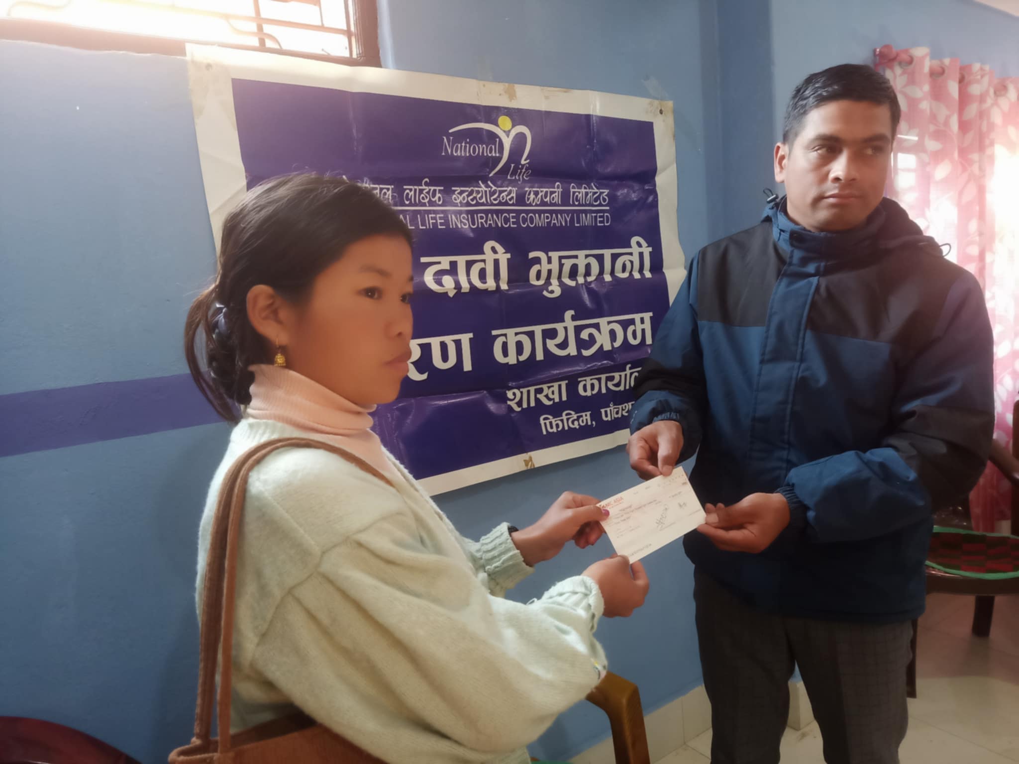 विमा कम्पनीको शाखा कार्यालय फिदिम पाँचथरका प्रमुख योगेन्द्र सुवेदीले घटनामा परी मृत्यू भएका ११ वर्षीय दिप्सन साँबाको आमा सिर्जना केरुङलाई १ लाख ३८ हजार ८ सय ३८ रुपैयाँको चेक हस्तान्तरण गर्दै मृत्यू दावी भूक्तानी गरेका हुन् । पीडित परिवारवाट प्राप्त हुनु पर्ने कागजात समयमा नआएकाले भूक्तानी गर्न केही ढिलाई भएको शाखा प्रमुख सुवेदीले बताए । मृतकको घरैमा गएर मृत्यू दावी भूक्तानी गर्ने तयारी भए पनि अन्य काम विशेषले मृतकको आमा सदरमुकाम फिदिममा भेटिएकाले उनलाई चेक हस्तान्तरण गरिएको उनले जानकारी दिए ।