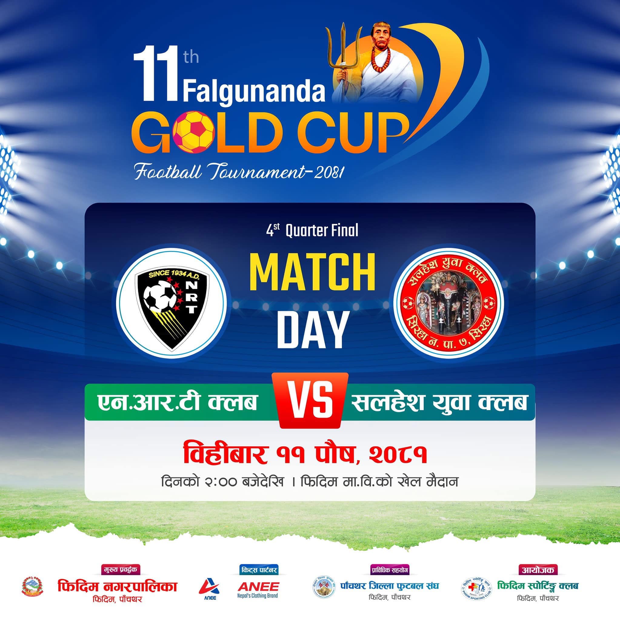 फिदिम माविको खेल मैदानमा दिउँसो २ः३० वजे हुने प्रतियोगिताको चौथो तथा अन्तिम क्वाटर फाईनलमा ए डिभिजन क्बल एनआरटीले पछिल्लो समय पूर्वमा राम्रो फुटबल खेलिरहेको सलहेशको सामना गर्न लागेको हो । राष्ट्रिय खेलाडी सहित उत्रले एनआरटीले आफ्नो लयलाई निरन्तरता दिनेछ । हालै मात्र झापा कपमा उपविजेता बनेको एनआरटीले सो भन्दा अगाडि इलाम गोल्डकपको उपाधि हात पारेको थिो ।