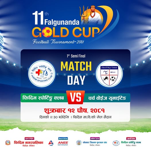 १२ पौष, पाँचथर । ११ औं संस्करणको फाल्गुनन्द गोल्डकप फुटबल प्रतियोगिता- २०८१ को पहिलो सेमिफाईनलमा आज आयोजक फिदिम स्पोर्टिङ क्लब र एपीआई चर्च बोइज युनाईटेड, काठमाण्डौ भिड्दै छन् ।