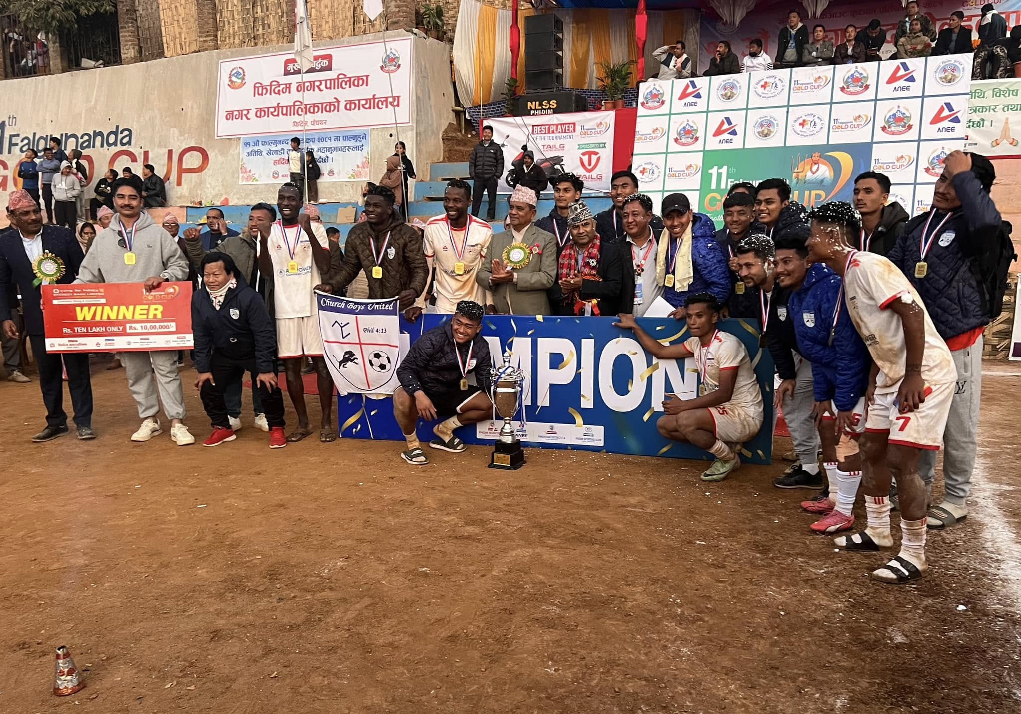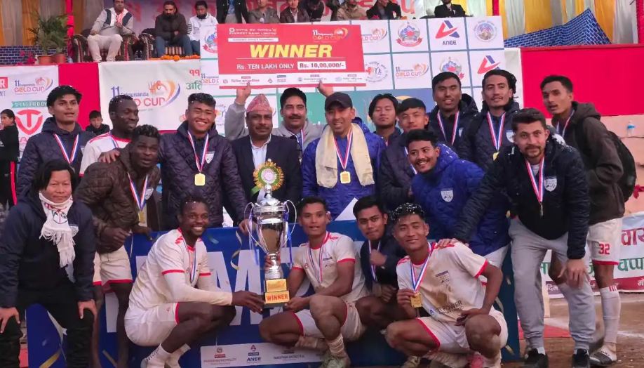 १५ पौष, पाँचथर । ११ औं संस्करणको फाल्गुनन्द गोल्डकप फुटबल प्रतियोगिता- २०८१ को उपाधि एपीआई पावर चर्च बोइज युनाइटेडले कब्जा गरेको छ । सोमबार भएको फाईनलमा मछिन्द्र फुटबल क्बल, काठमाण्डौलाई टाईब्रेरकमा पराजित गर्दै चर्च बोइजले उपाधि कब्जा गरेको हो ।
