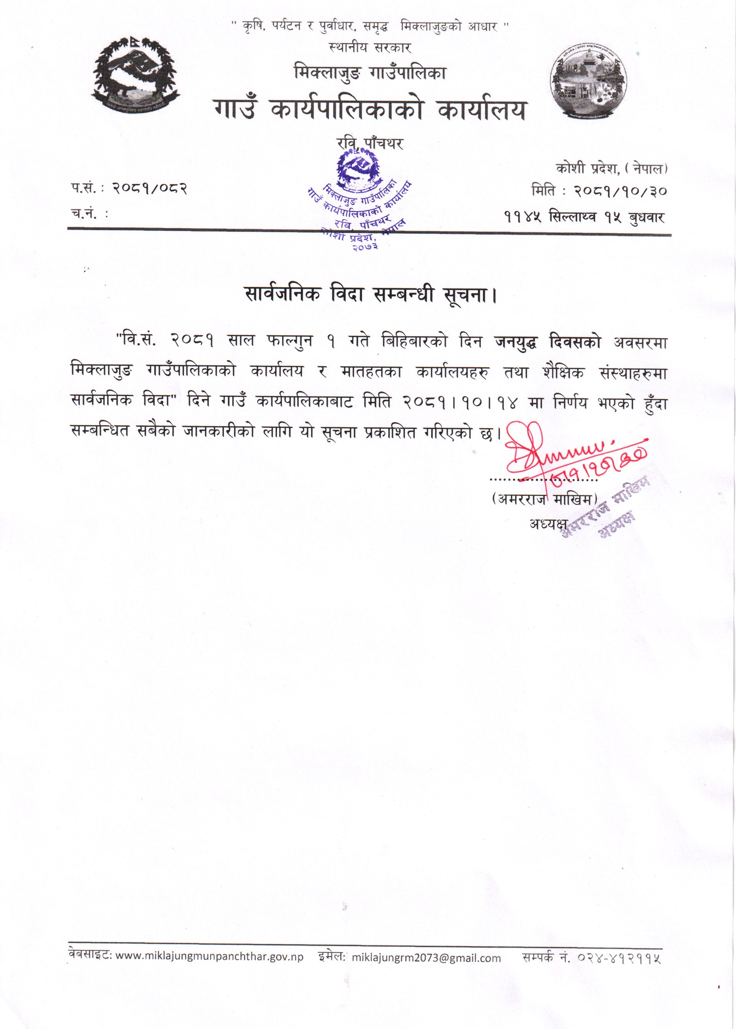 ३० माघ, पाँचथर । पाँचथरको मिक्लाजुङ गाउँपालिकाले जनयुद्ध दिवसको अवसरमा विहिबार (फागुन १ गते) सार्वजनिक विदा दिएको छ ।