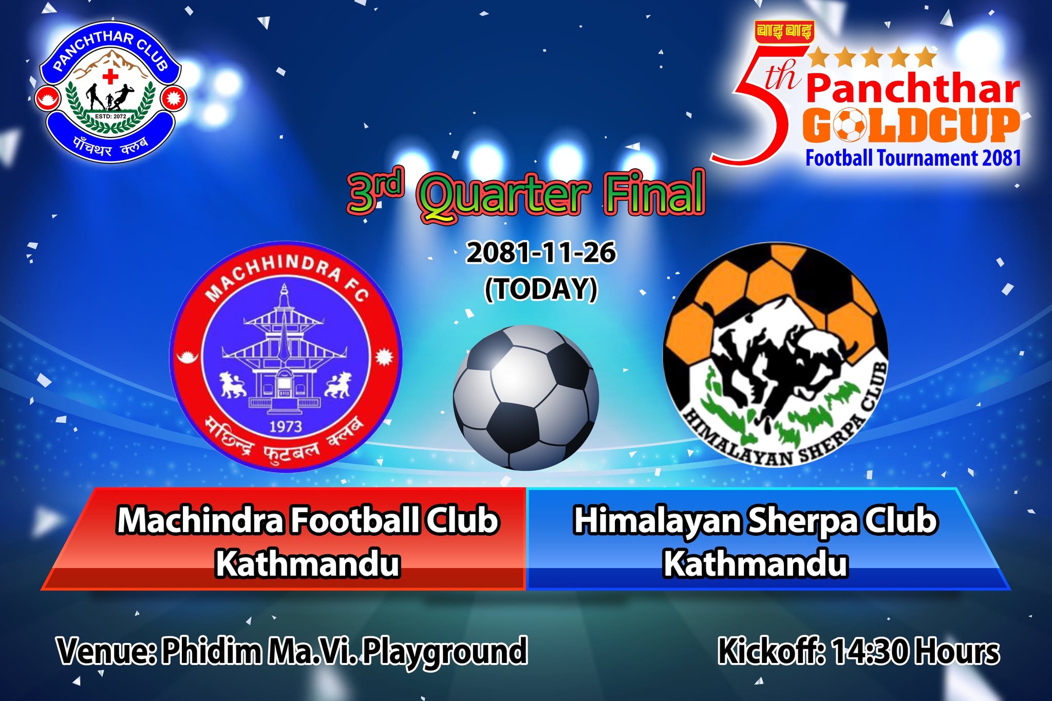 फिदिम माविको खेल मैदानमा दिउँसो २ः३० वजे हुने प्रतियोगिताको तेस्रो क्वाटर फाईनलमा ए डिभिजनका दुई क्बलहरु आमने सामने हुन लागेका हुन् । राष्ट्रिय खेलाडीहरुले भरिभराउ मछिन्द्रको लयलाई रोक्न हिमालयन शेर्पालाई चुनौती हुनेछ । यो खेल मैदानमा मछिन्द्रलाई हालै सम्पन्न ११ औं संस्करणको फल्गुनन्द गोल्डकपको फाईनल खेलेको अनुभव छ । दुवै टोलीको लक्ष्य सेमिफाईनलमा प्रवेश हुने रहेको छ ।