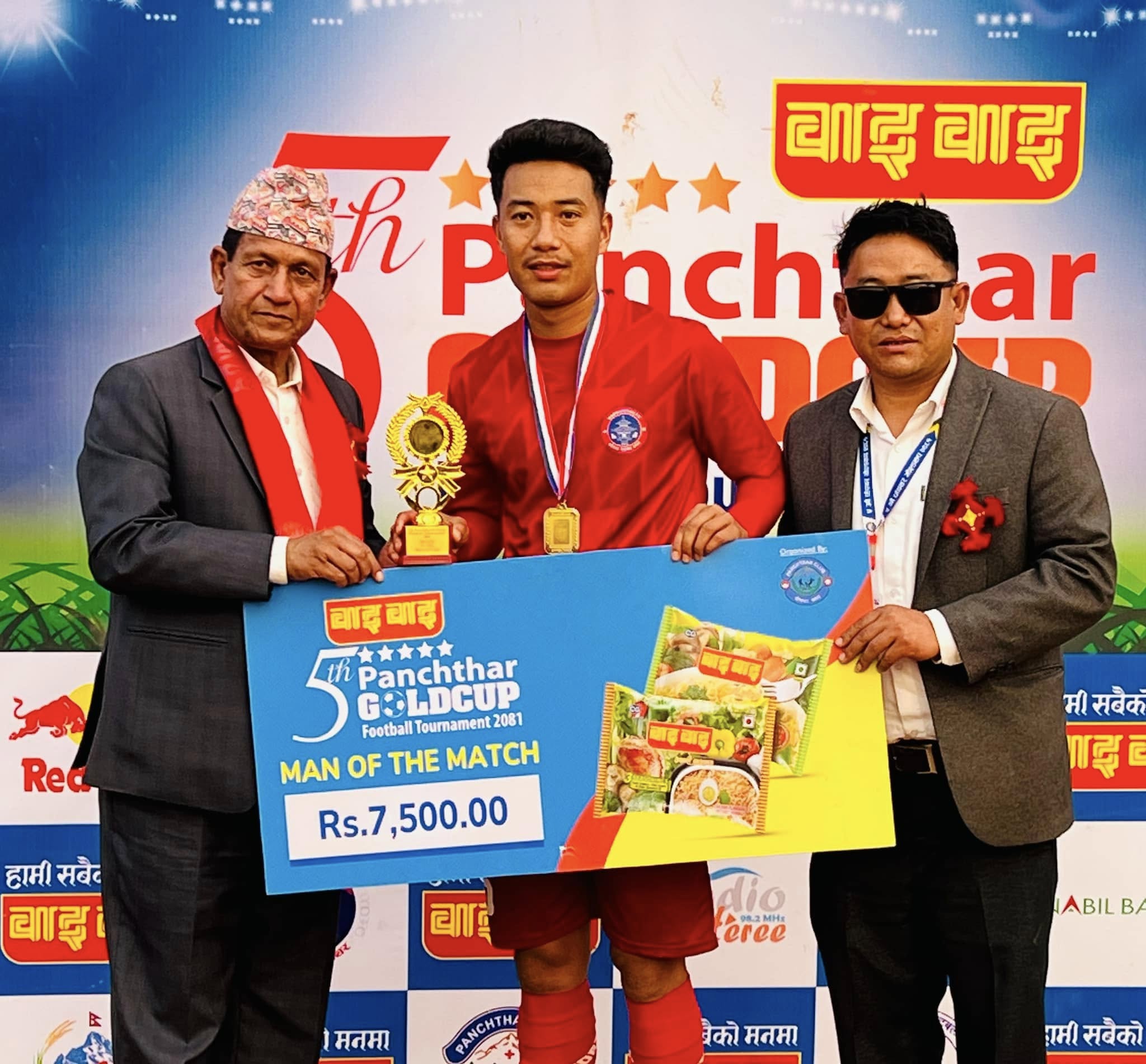 तेस्रो क्वाटर फाईनलको म्यान अफ दि म्याच मछिन्द्रका बिशाल घलान घोषित भए । उनलाई कार्यक्रमका प्रमुख अतिथि नेकपा एमालेका प्रदेश कमिटि सचिव राजकुमार भण्डारी र आयोजक पाँचथर क्लबका अध्यक्ष कमल तुम्रोकले नगद ७ हजार ५ सय र ट्रफी हस्तान्तरण गरे ।