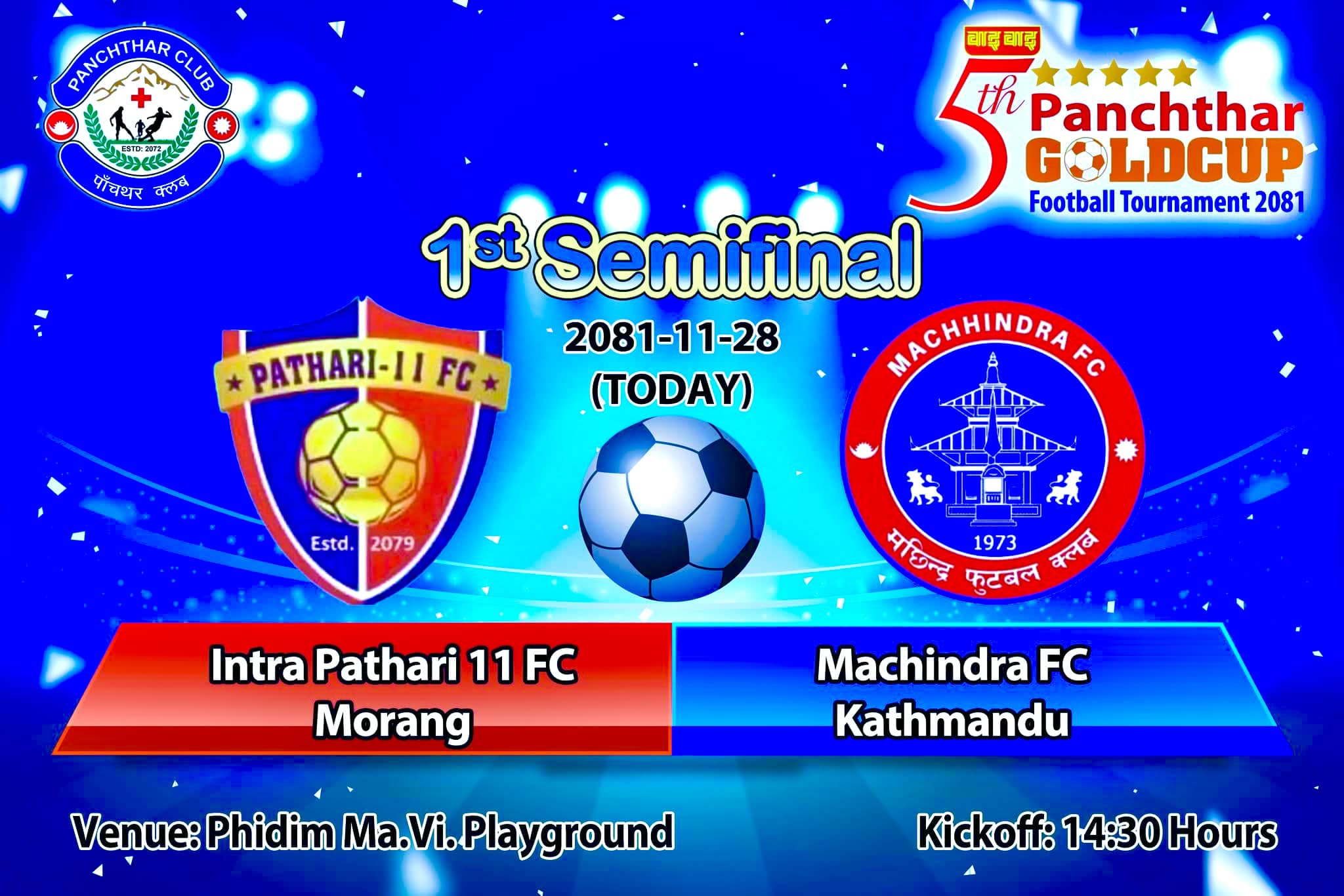 फिदिम माविको खेल मैदानमा दिउँसो २ वजे हुने खेलमा दुवै टोलीको लक्ष्य फाईनल प्रवेश हुनेछ । मछिन्द्रले गत सोमबार भएको तेस्रो क्वाटरफाईनलमा हिमालयन शेर्पा क्लबलाई २–१ ले हराउँदै सेमिफाईनलमा प्रवेश गरेको हो । यसै गरी, पथरी– ११ ले आयोजक पाँचथर क्लबलाई प्रतियोगिताको उद्घाटन खेलमा १–० ले पराजित गर्दै सेमिफाईनलको यात्रा तय गरेको थियो ।
