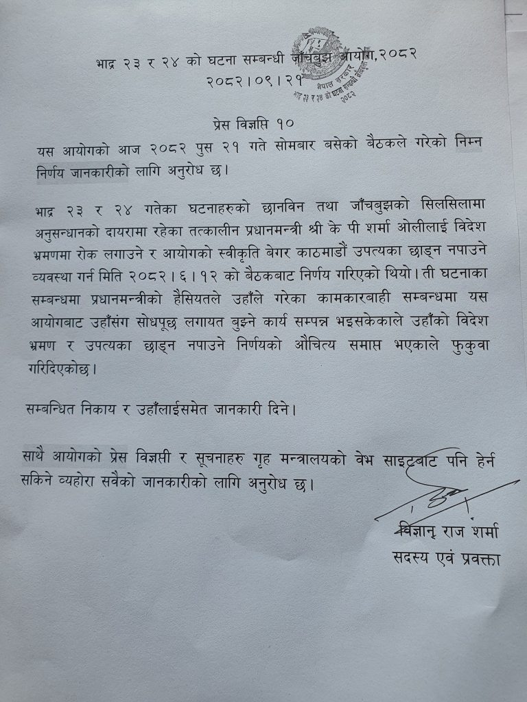 आयोगले तत्कालिन गृहमन्त्री रमेश लेखक, नेपाल प्रहरीका प्रहरी महानिरीक्षक चन्द्रकुवेर खापुङ, काठमाण्डौका प्रमुख जिल्ला अधिकारी छवि रिजाललाई समेत यसअघि वयान लिएर स्थान हद फुकुवा गरेको थियो । जेनजी आन्दोलनपछि ओली नेतृत्वको सरकार अपदस्त भएसँगै शुशीला कार्की नेतृत्वको नागरिक सरकार गठन भएको छ । वर्तमान सरकारले आगामी फागुन २१ गते प्रतिनिधि सभा सदस्यको निर्वाचन गर्ने तयारी गरेको छ ।