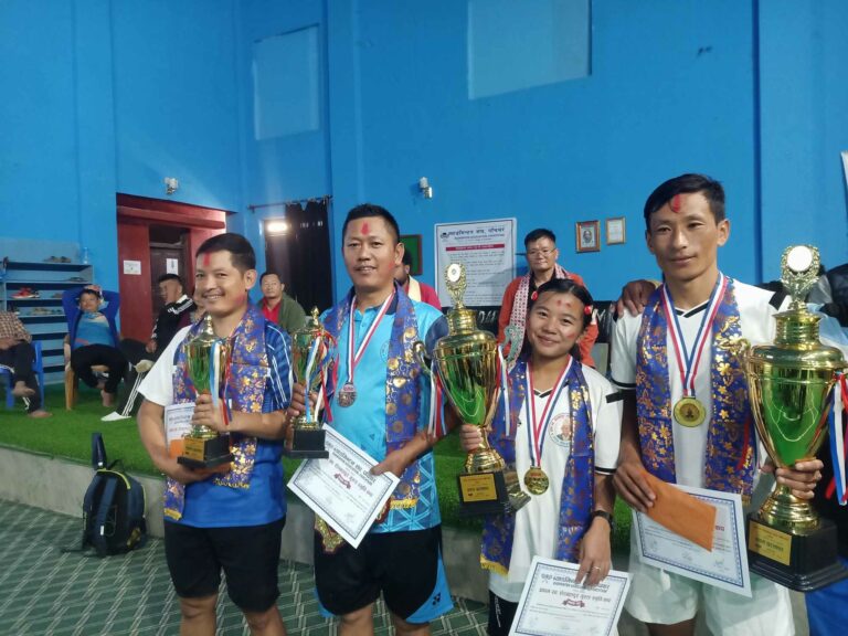 पाँचथर । प्रथम स्व. शेरबहादुर गुरुङ स्मृति कप खुल्ला ब्याडमिन्टन प्रतियोगिताको उपाधि छाँया केरुङ र शैलेस आङदेम्बेको जोडिले हात पारेका छन् । जिल्ला सदरमुकाम स्थित जिससको ब्याडमिन्टन हलमा बुधबार आयोजित फाईनल खेलमा जय नेम्बाङ र भीम केरुङको जोडिलाई पराजित गर्दै केरुङ र आङदेम्बेको जोडिले उपाधि हात पारेका हुन् ।