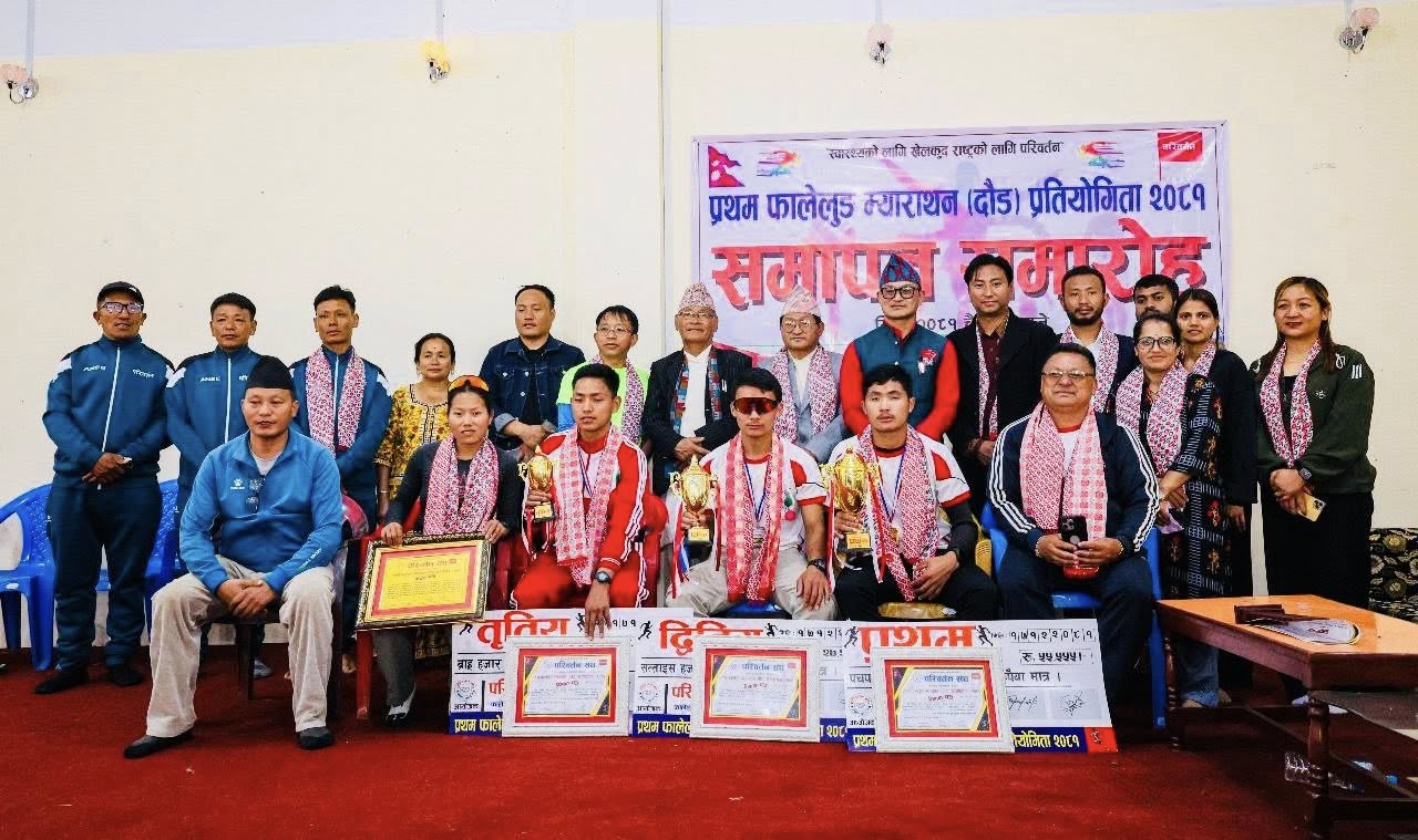 १८ चैत्र, पाँचथर । प्रथम फालेलुङ म्याराथनको उपाधि ताप्लेजुङका रमेश तावाहाङ लिम्बूले चुमेका छन् । शनिबार फालेलुङमा आयोजित म्याराथनको निर्धारित ४२ किलोमिटर दुरी ३ घण्टा २२ मिनेटमा पार गर्दै तावाहाङले उपाधि हात पारेका हुन् । म्याराथनमा पाँचथरका विशाल राई द्धितीय र त्रिभुवन आर्मी क्लब, काठमाडौंका
