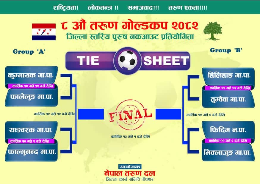 प्रतियोगिताको बिजेता टिमले १ लाख १ सय ७३ रुपैँया र उपबिजेता टिमले ५१ हजार १ सय ७३ रुपैँया सहित ट्रफी मेडल र प्रमाण पत्र प्राप्त गर्ने मंगल बेघा १० कार्तिक, पाँचथर । ८ औं तरुण गोल्डकप– २०८२ जिल्ला स्तरीय पुरुष नकआउट फुटबल प्रतियोगिता आजदेखि जिल्ला