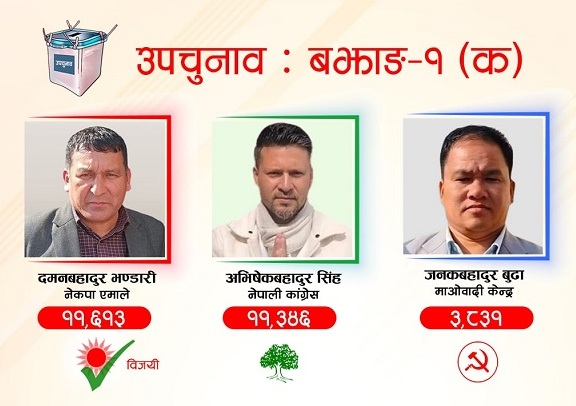 काठमाण्डाै – बझाङको प्रदेश सभा क्षेत्र नम्बर १ (क) मा भएकाे उपचुनावमा नेकपा एमालेका उम्मेदवार दमनबहादुर भण्डारी निर्वाचित हुनुभएको छ । एमालेका उम्मेदवार भण्डारी ११ हजार ६ सय १३ मत प्राप्त गरी विजयी हुनुभएकाे निर्वाचन आयाेगले जनाएकाे छ । भण्डारी २ सय ६७ मतान्तरसहित विजयी हुनुभयाे ।